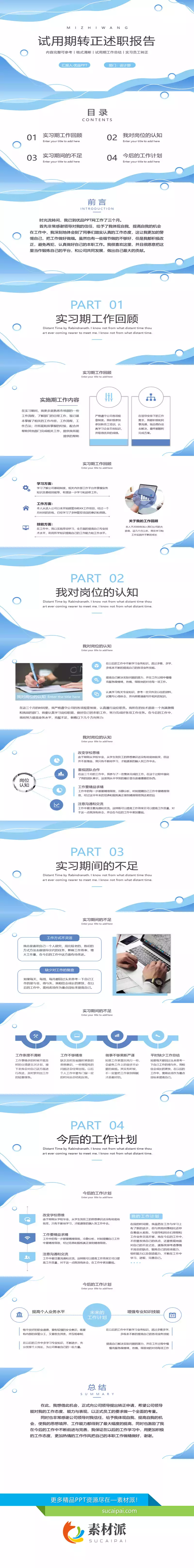 蓝色波浪试用转正述职报告PPT模板 - 素材派PPT