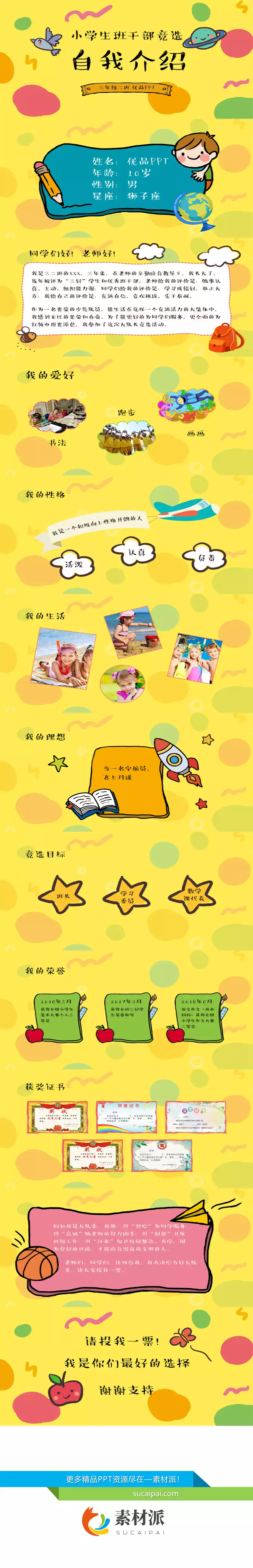 小学生班干部竞选自我介绍PPT模板 - 素材派PPT